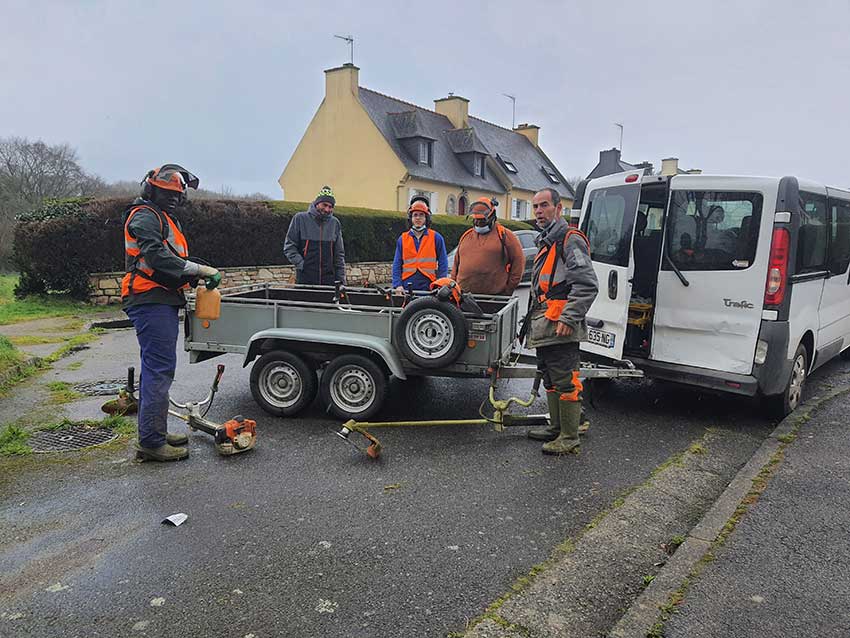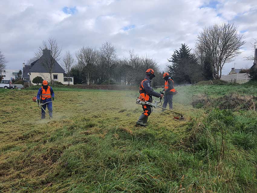 Depuis plusieurs années, la métropole de Brest s’attache à préserver des zones de biodiversité au sein du tissu urbain. La prairie de Keravilin en faisant partie, elle est fauchée seulement deux fois par an. Aussi, pour faciliter la mise en place de la sculpture, G. Martin me propose de faire intervenir une équipe de débroussaillage avant de commencer le chantier.